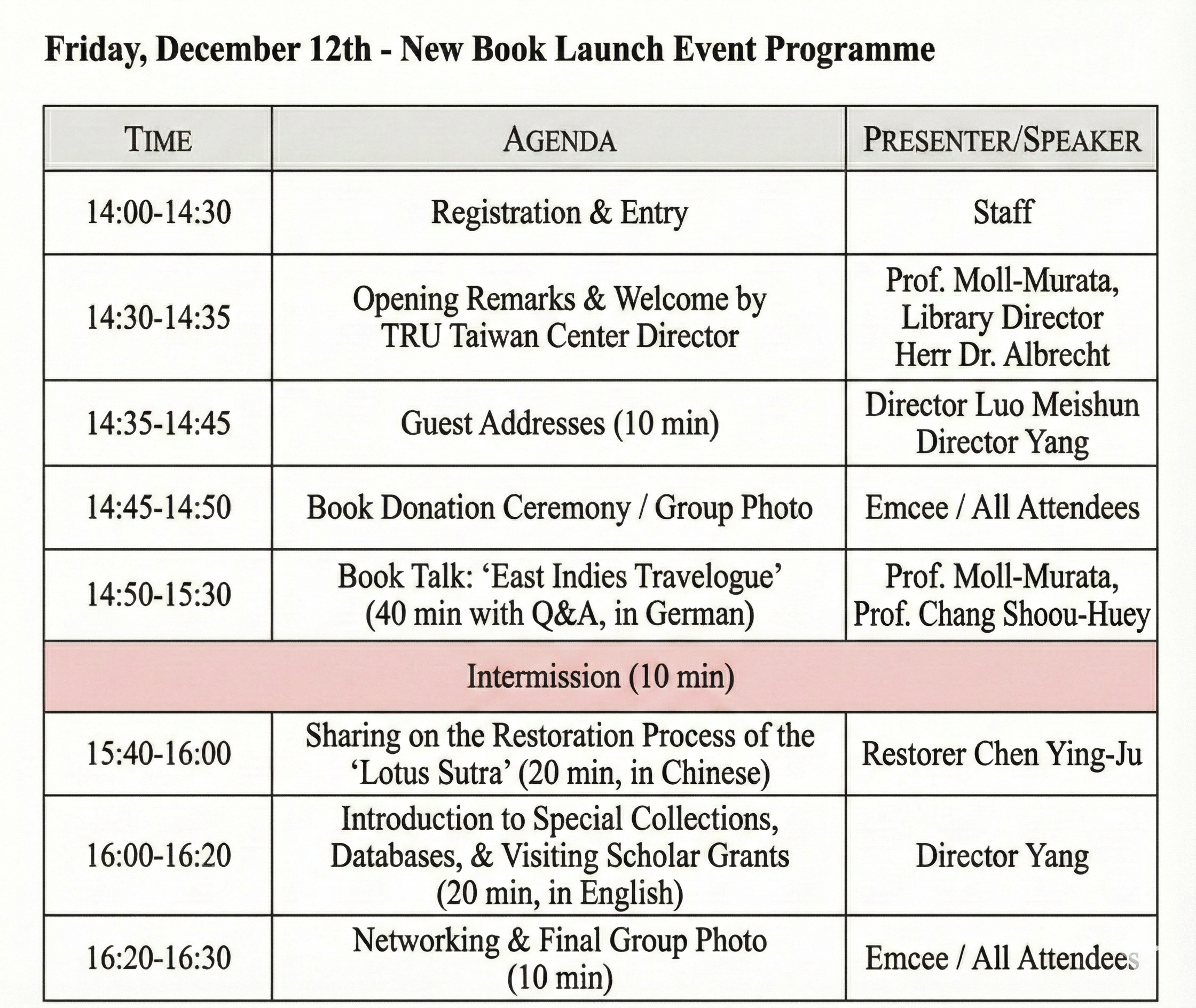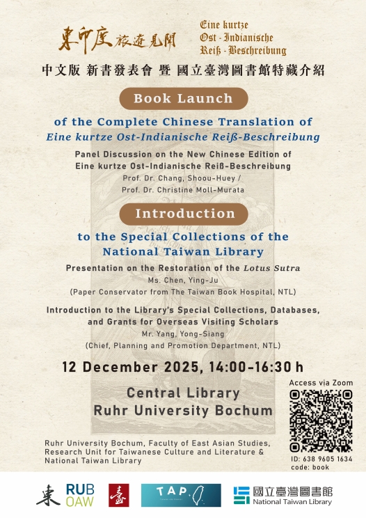 In cooperation with the Faculty of East Asian Studies at Ruhr University Bochum the National Taiwan Library will introduce its newly published Chinese translation of the book “Eine kurtze Ost-Indianische Reiß-Beschreibung” (1669) by the Swiss painter and traveler Albrecht Herport (1641-1730).